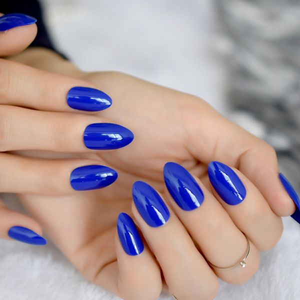 Shiny Sapphire Blue Candy Nail Art Almond Design Pointed Medium Artificial Fake Nails Kit Easy Diy Finger Tips Pure Color 300p Nail Courses Nail Foil
